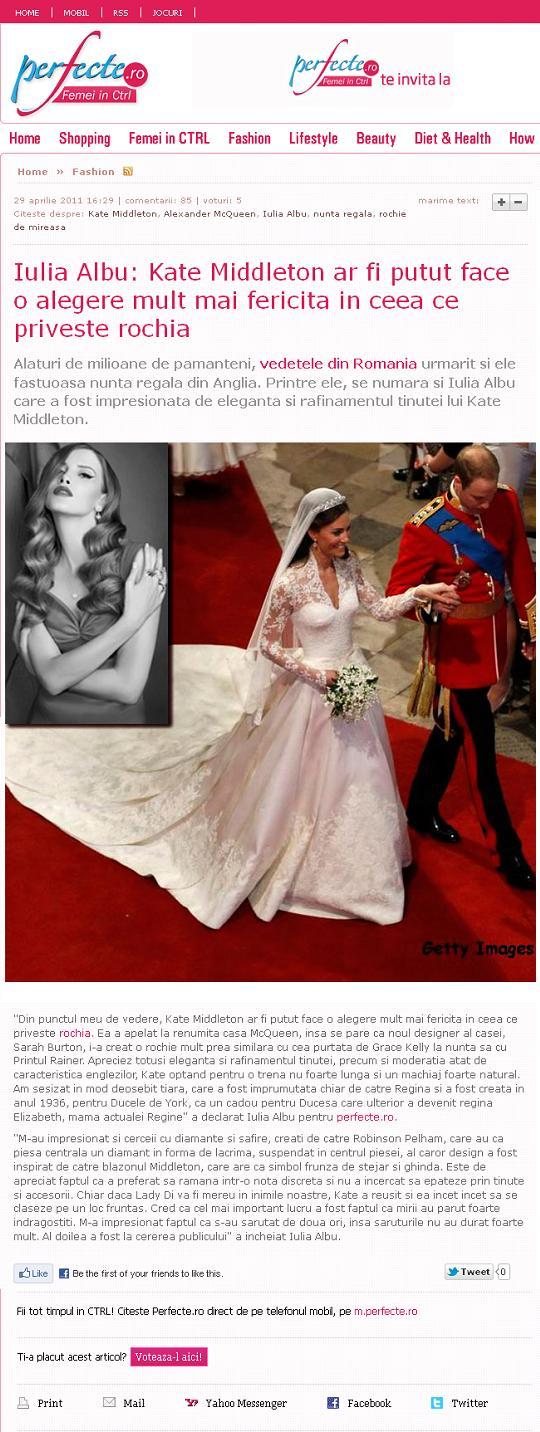 Va propun o scurta analiza a stilului celei ce a devenit DUCESA DE CAMBRIDGE... ROCHIA DE MIREASA: Mai mult decat "inspirata" de rochia de mireasa purtata de Grace Kelly, rochia purtata de Kate nu a reusit sa ne impresioneze prin originalitate, desi Sarah Burton, aflata la conducerea casei Alexander McQueen si-a confirmat intre timp statutul, depasind rapid "derapajul"...